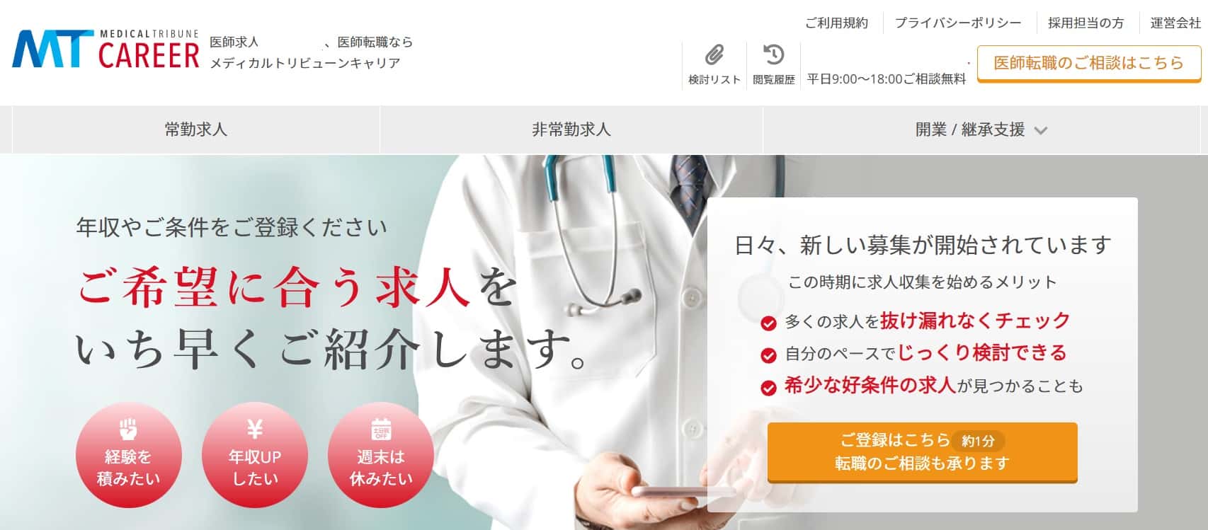常勤医師求人はもちろん、非常勤医師求人も扱っています。