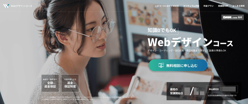 DMM WEBCAMPは、DMM.comが監修するWebデザインスクールです。DMM WEBCAMPは、元々、プログラミング学習に強みを持っているため、各種プログラミング学習のコースと組み合わせて動的なデザインを学習できる点がおすすめです!