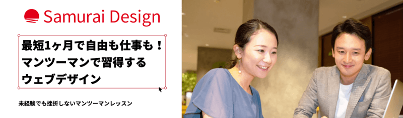 名前の通り、エンジニアを育成するオンラインプログラミングスクールとして有名なSAMURAI ENGINEER(侍エンジニア)が新たに開始したWebデザインスクール。それが「侍エンジニア WEBデザインコース」です。オンライン学習ながら、現役Webデザイナーから直接教わるマンツーマンで進めるレッスンがウリでもあります。