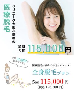 | 全身脱毛料金(顔・VIO込み) | 163,000円(税込)/5回 |