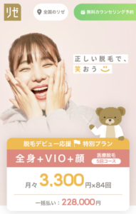 今ならキャンペーンで、現金又はクレジットカードで一括払いをすると、1万円OFFの118,800円でVIO含む全身脱毛を6回受けられます。