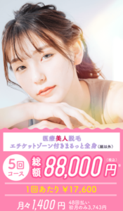 - VIO込みの全身脱毛(5回)が10万円以下!