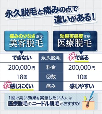 一方、医療脱毛では永久脱毛ができると米国FDAにて認められています。しかし、威力の強い医療脱毛機を使用できる分、痛みは感じやすい傾向に。医療脱毛は痛みが強くても効果を重視したい人におすすめです。