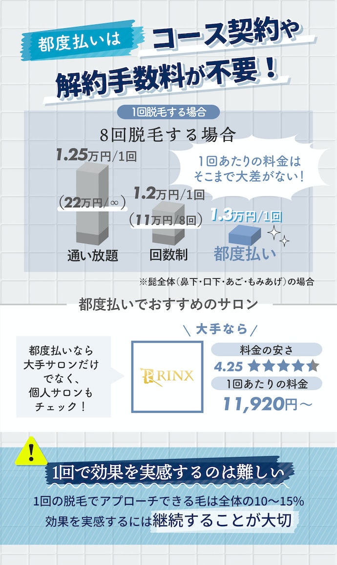 ただし、都度払いプランはコースでない分次回いつ脱毛するかは自分次第なので、自分で状態を見ながら進めることが必要です。また、1回の脱毛で効果を実感することは難しく、ツルツルにするには何度も脱毛する必要があることは覚えておいてくださいね。