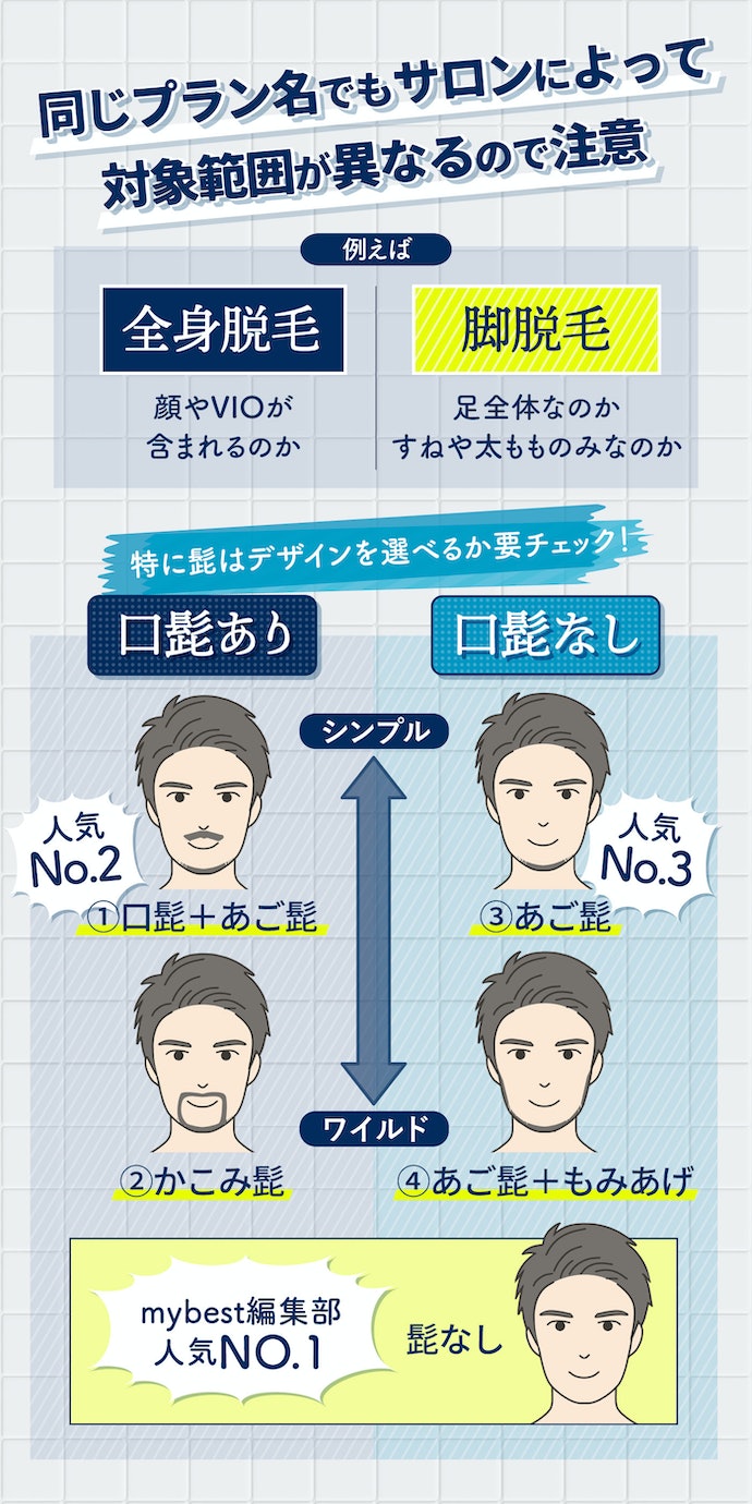 ①髭脱毛は鼻下・口下・あご・もみあげを含むプランで比較