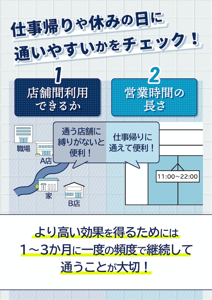 - ⑦ 継続のしやすさに直結!仕事帰りにも通いやすいサロンを選ぼう
