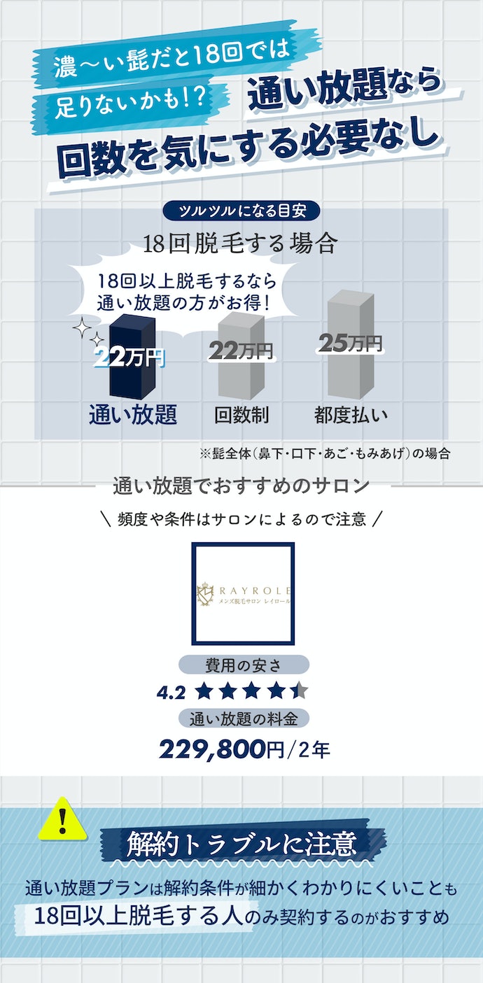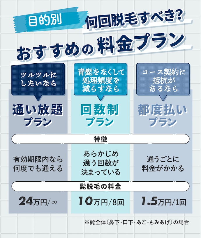 髭をはじめ脱毛したい部分をツルツルにするには、18回以上脱毛すべきとされています。そのため、ツルツルにしたい人は何度も脱毛できる通い放題プランがあるサロンを選びましょう。