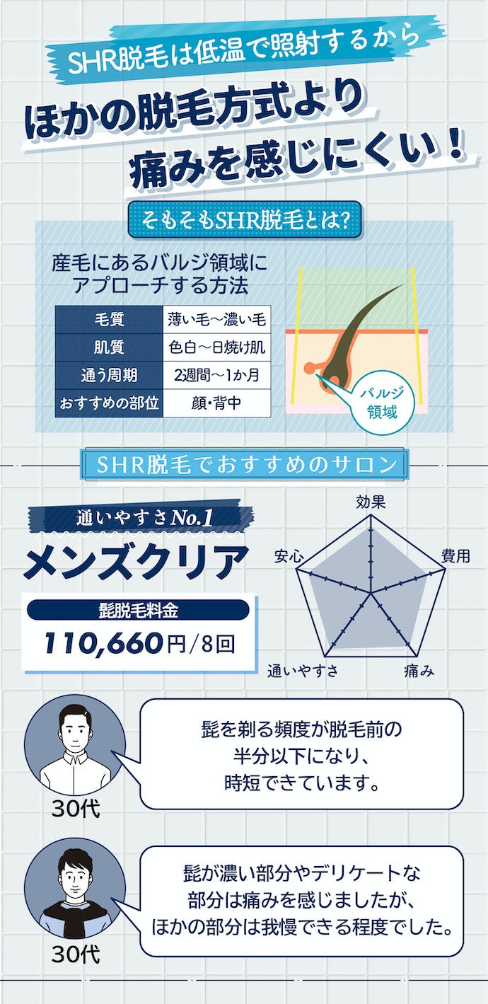 SHR脱毛ができるメンズ脱毛サロンならメンズクリアがおすすめです。コース終了後に回数を追加する場合、料金が最大90%オフになるアフター保証があるのはうれしいポイント。効果に関しても「自己処理が楽になった」との声が多く、効果を実感している人が多いことがうかがえます。
