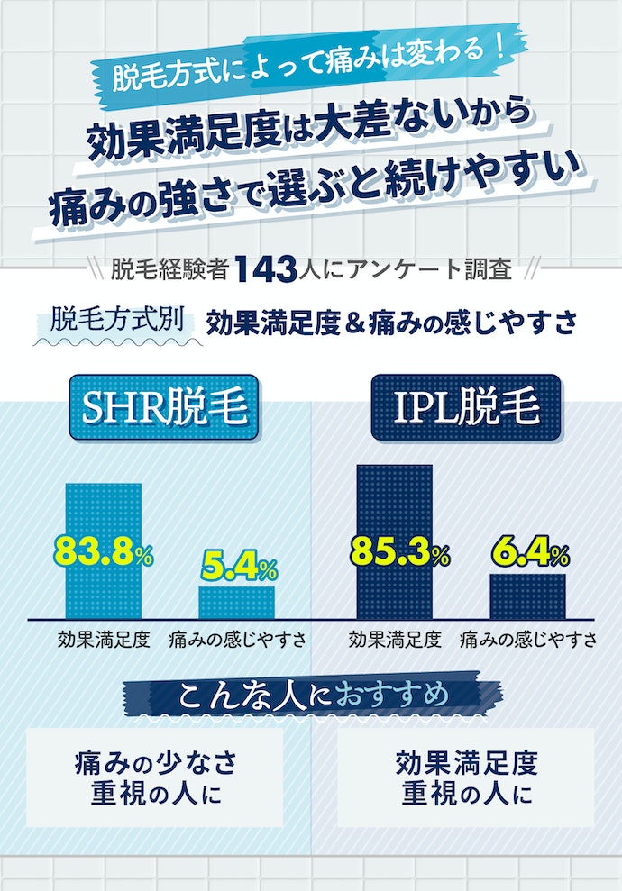 効果を重視したいという人にはIPL脱毛がおすすめです。今回脱毛経験者143人にとったアンケートでは、85.3%が効果に満足しており、83.7%が痛みが少ないと回答しました。