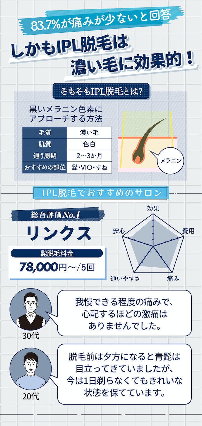 IPL脱毛ができるメンズ脱毛サロンなら、リンクスがおすすめです。リンクスは、料金が相場よりもお得なうえ、11回目以降の脱毛料金が通常料金の80%オフになる点が魅力的といえます。痛みに関しても「髭でやや痛みを感じる程度」との声が多く、痛みが心配な人におすすめです。